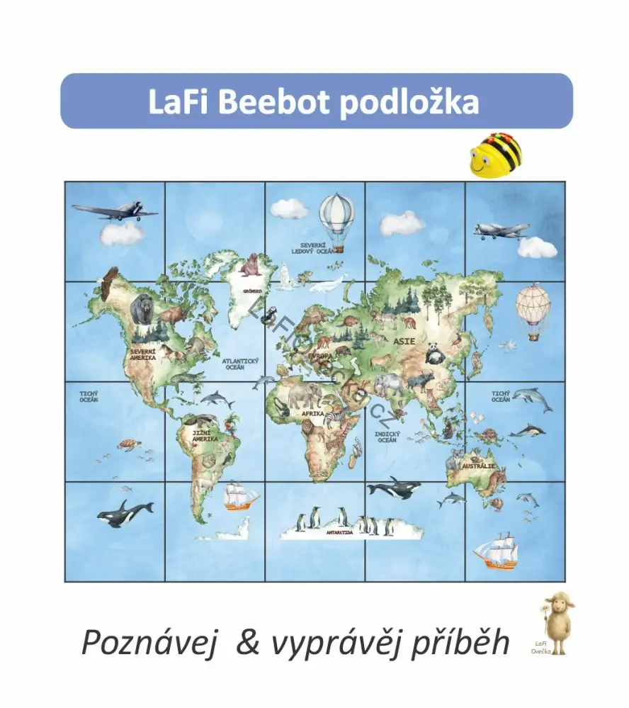 LaFi BeeBot podložka – Mapa světa se zvířaty (české názvy) je omyvatelná výuková podložka pro děti v mateřské škole, škole i pro domácí učení. Je připravená pro roboty Bee-Bot a Blue-Bot, ale skvěle funguje i bez robota jako samostatná vzdělávací pomůcka pro poznávání světadílů, zvířat, oceánů, prostorové orientace a rozvoje slovní zásoby.