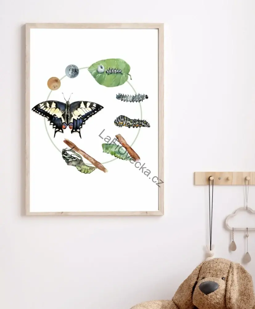 LaFi edukační plakát – Životní cyklus motýl je přehledná obrázková pomůcka pro děti, která pomáhá pochopit, jak se vyvíjí motýl v jednotlivých krocích. Plakát využijete v dětském pokoji, dětských centrech, MŠ i ZŠ – pro povídání, pozorování a rozvoj slovní zásoby.