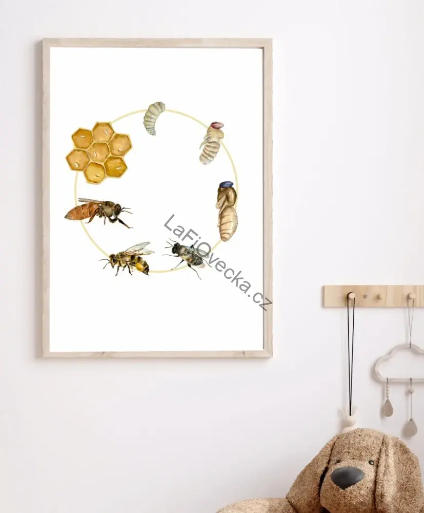 LaFi edukační plakát – Životní cyklus včela je přehledná obrázková pomůcka pro děti, která pomáhá pochopit, jak se vyvíjí včela v jednotlivých krocích. Plakát využijete v dětském pokoji, dětských centrech, MŠ i ZŠ – pro povídání, pozorování a rozvoj slovní zásoby.