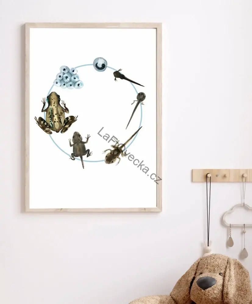 LaFi edukační plakát – Životní cyklus žába je přehledná obrázková pomůcka pro děti, která pomáhá pochopit, jak se vyvíjí žába v jednotlivých krocích. Plakát využijete v dětském pokoji, dětských centrech, MŠ i ZŠ – pro povídání, pozorování a rozvoj slovní zásoby.