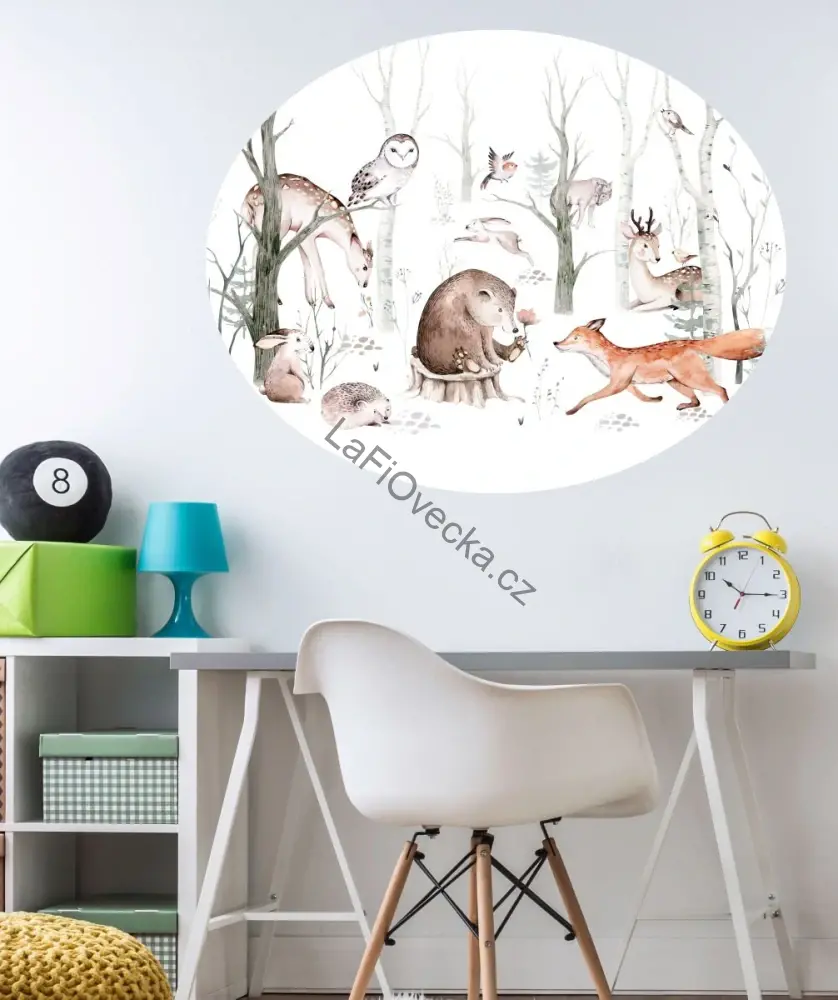 LaFi samolepka na zeď – Lesní zvířátka (ovál) je jemná dekorace do dětského pokoje, která propojuje něžné lesní motivy s klidnou přírodní atmosférou. Akvarelově laděná ilustrace s lesními zvířátky působí na zdi harmonicky, vzdušně a nerušivě. Hodí se nad psací stůl, k posteli, do čtecího koutku i na hlavní stěnu pokojíčku.