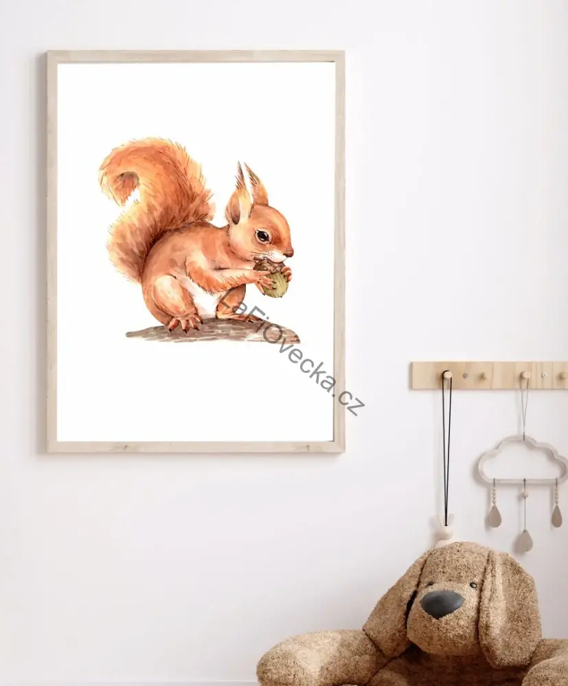 Dekorativní plakát s veverkou v jemném akvarelovém stylu je krásnou volbou do dětského pokoje, herničky i čtecího koutku. Lesní motiv působí klidně, mile a přirozeně a snadno ladí se skandinávským i přírodním interiérem.