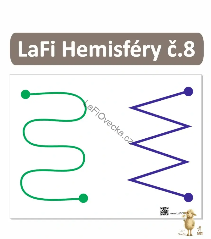 LaFi podložka – Hemisféry č. 8 (tvary pro dvě ruce) je jednoduchá, přehledná a velmi účinná pomůcka na propojení hemisfér, koordinaci obou rukou a trénink soustředění. Klíčové pravidlo je snadné: jedna barva = jedna ruka.