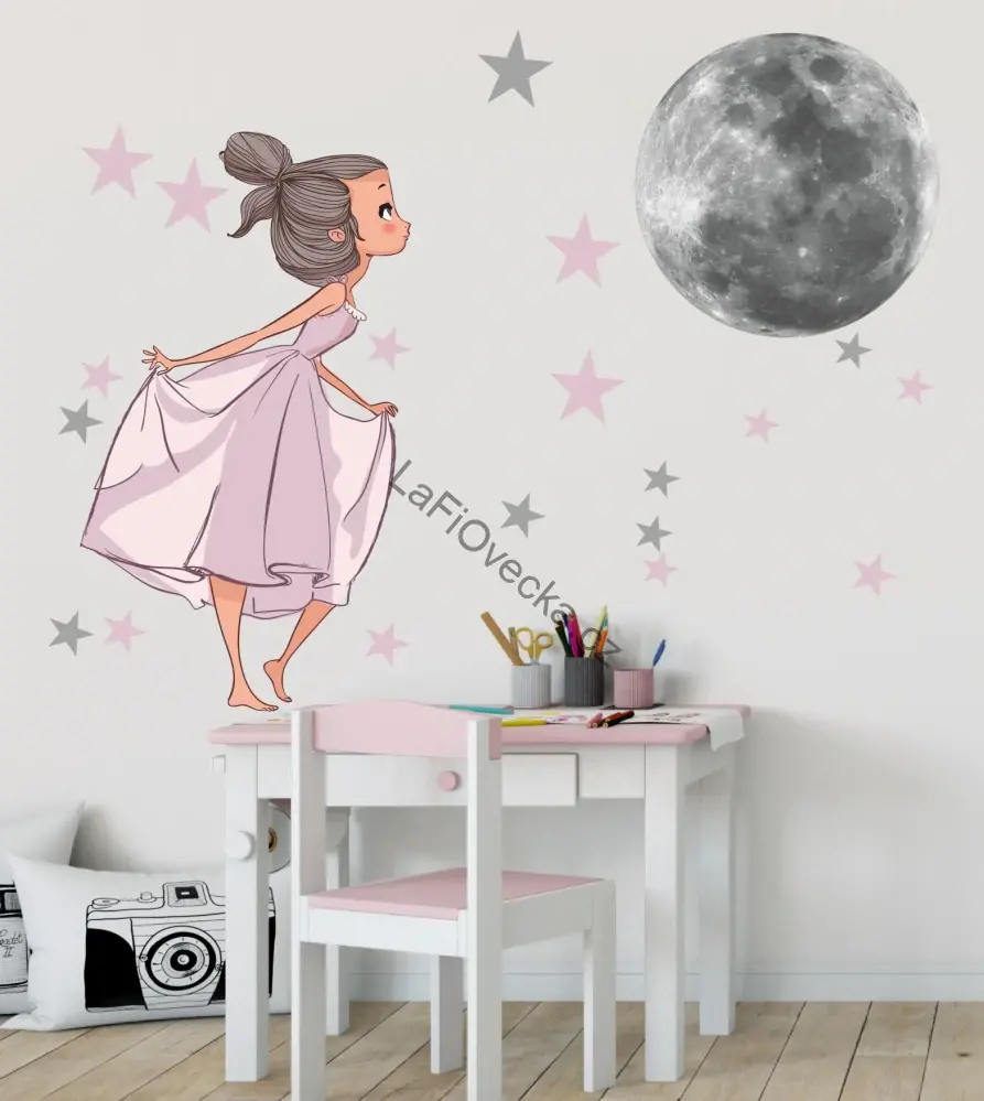 LaFi samolepka na zeď – Dívka a měsíc | sada s hvězdičkami | MINI / MIDI / MAXI / na míru