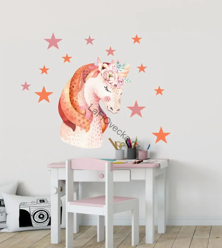 Jednorožec je laděný do jemných růžových a meruňkových tónů, díky kterým působí něžně, ale zároveň elegantně. Hvězdičky kolem motivu prostor hezky doplní a pomohou vytvořit útulný dětský koutek bez zbytečného zahlcení stěny.