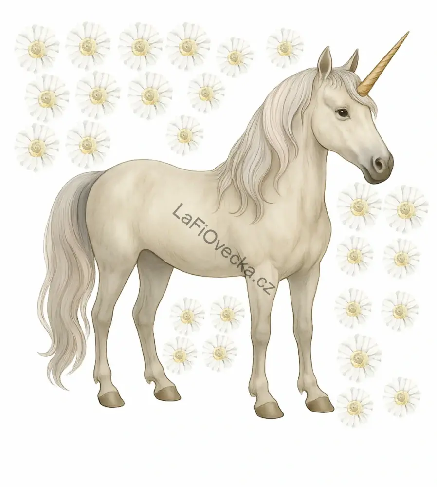 LaFi samolepka na zeď Jednorožec s bílými květy je jemná akvarelová dekorace do dětského pokoje. Vytvoří útulný, klidný a něžný prostor, ve kterém se děti cítí příjemně. Jednorožec působí mile a přirozeně, proto se hodí hlavně do dívčího pokojíčku, herničky nebo dětského koutku.