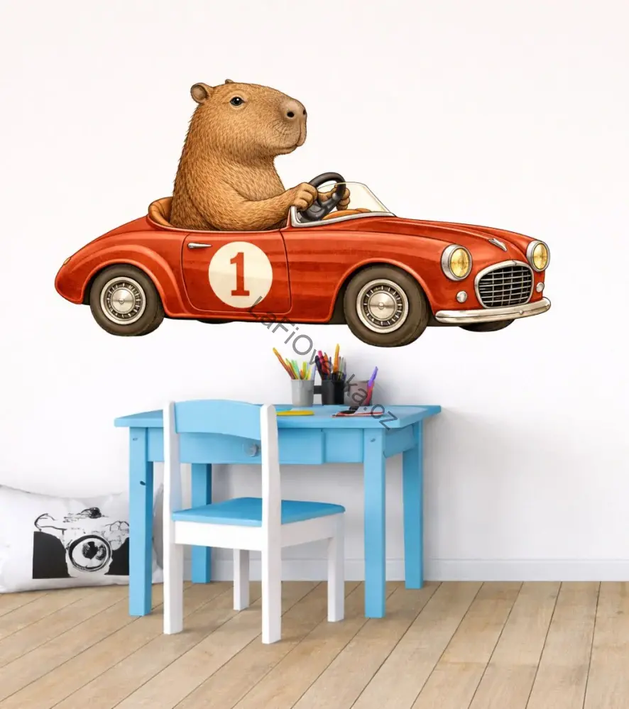 Tato dětská samolepka na zeď s kapybarou v autě se hodí nad dětský stoleček, do hracího koutku, k posteli, na hlavní stěnu pokojíčku, ale i na dveře, skříň nebo jiný hladký povrch.