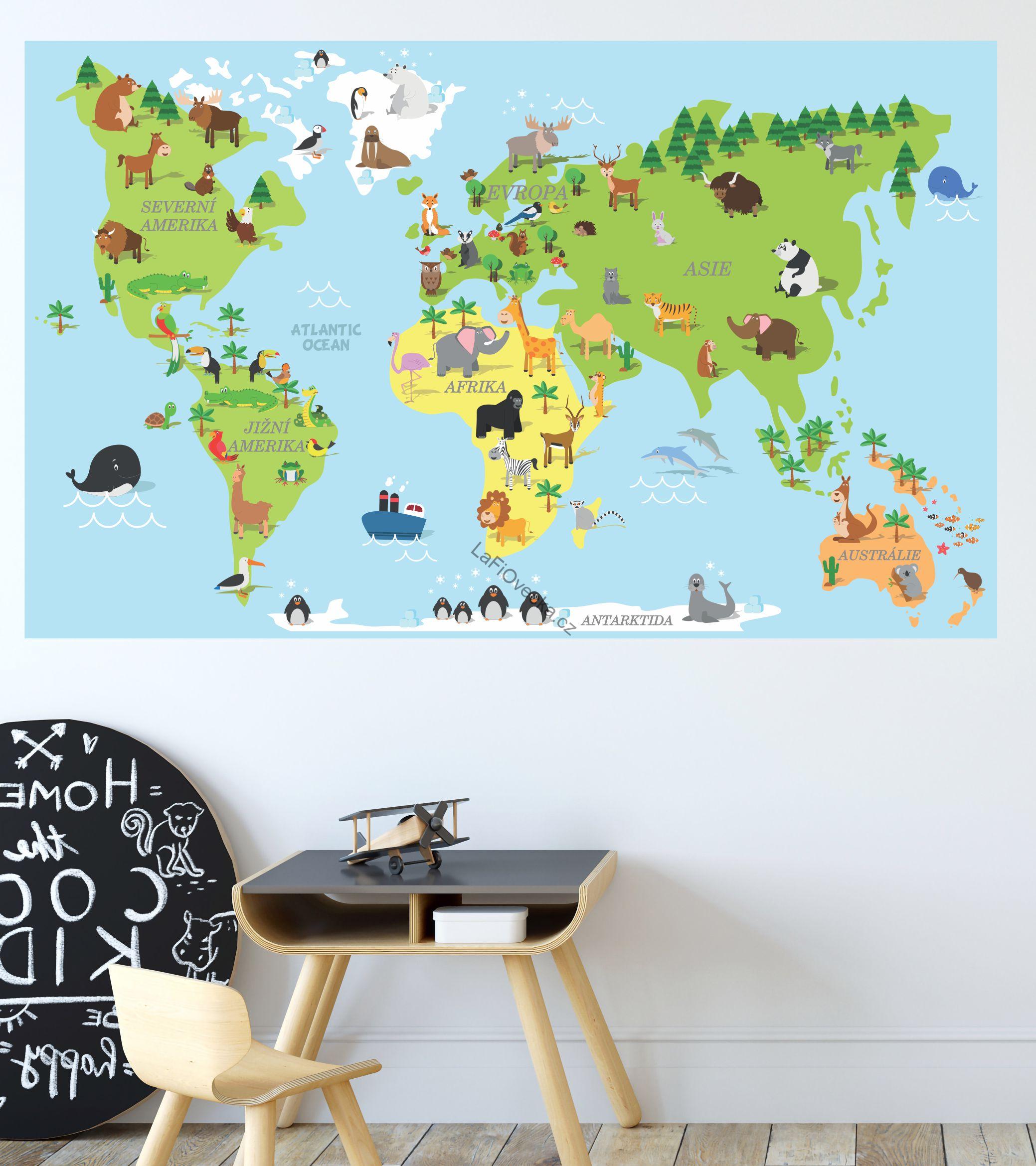 LaFi samolepka na zeď pro děti – Dětská mapa světa se zvířátky (CZ) | textilní bez PVC | 1 díl
