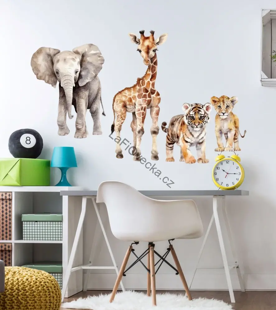 LaFi samolepka na zeď – Safari mláďata (slůně, žirafa, tygřík, lvíče)