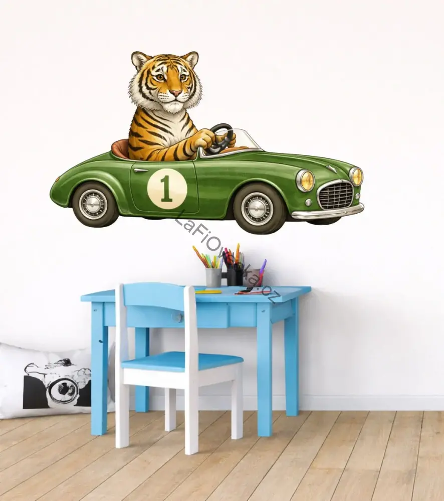 Tato dětská samolepka na zeď s tygrem v autě se hodí nad dětský stoleček, do hracího koutku, k posteli, na hlavní stěnu pokojíčku, ale i na dveře, skříň nebo jiný hladký povrch.