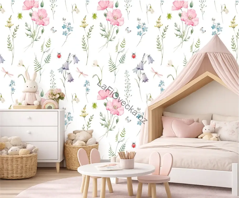 Tapeta Luční kvíti - opakující se motiv je velmi oblíbená. Vhodná do dívčího pokojíčku. Díky možnosti zvolit si rozměr na míru je možné tapetu přizpůsobit pouze na pás široký 100 cm a výška 250cm. Nebo vytapetovat tímto motive celou zeď od stropu až po podlahu a ode zdi ke zdi. U LaFi tapet na míru, nemusíte počítat kolik potřebujete rolí. Máte připravené pásy k tapetování přesně na míru.