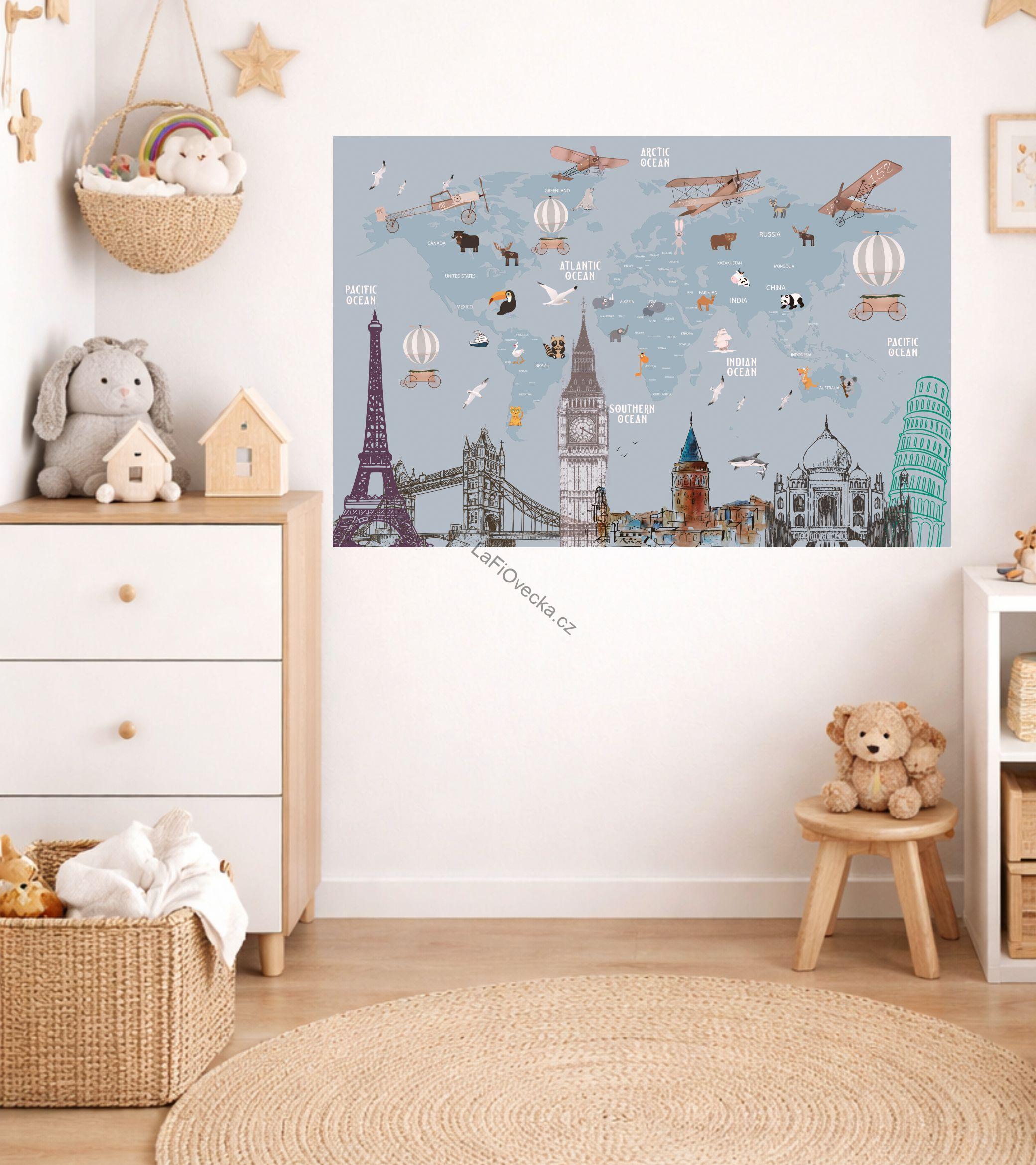 LaFi textilní samolepka na zeď – Mapa světa s dominantami (EN) je krásná dekorace do dětského pokoje a zároveň jemně edukativní prvek pro každodenní objevování.