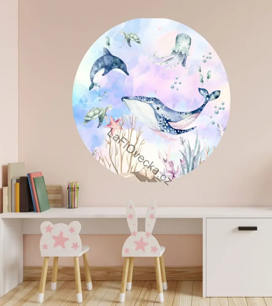 LaFi samolepka na zeď – Mořský svět (kruh) je jemná dekorace do dětského pokoje, která propojuje hravý podmořský motiv s něžnou pastelovou atmosférou. Akvarelově laděná ilustrace s velrybou, delfínem, želvami, medúzou a dalšími mořskými prvky působí na zdi lehce, snově a harmonicky. Hodí se nad dětský stoleček, k posteli, do hracího koutku i na hlavní stěnu pokojíčku.