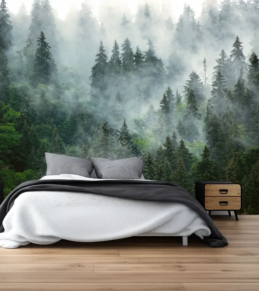 Tapeta na zeď - Les v mlze (fototapeta, jehličnatý les). Tato tapeta je řazena mezi nejoblíbenější mezi zákazníky. Motiv je nadčasový a neutrální pro všechny prostory. Hodí se do dětského pokoje, ale i do chodby nebo za sedací soupravu do obyvacího pokoje. Tapetu les v mlze jsme schopni připravit přesně na míru, aby působila jako velkoplošný obraz. Ale zároveň, pokud potřebujete oživit bílou skříň v chodbě a zašlete nám přesné rozměry skříně není problém vše připravit na míru.