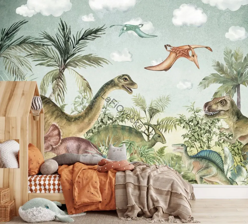 Tapeta na zeď Dinosauří džungle (akvarel ilustrace). Pterosauři svět plný dinosaurů, palem a listů – motiv, který vypadá dobrodružně, ale díky tlumeným barvám působí v pokojíčku příjemně a harmonicky