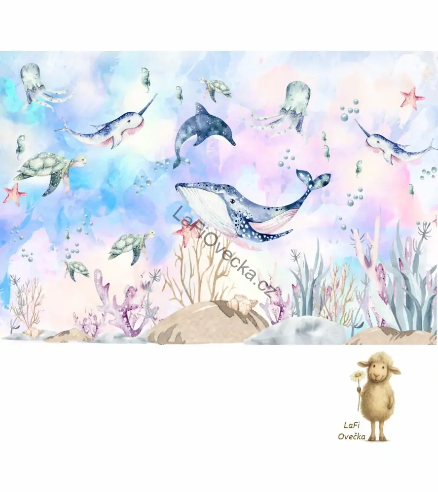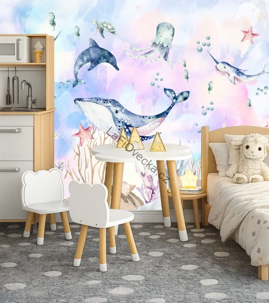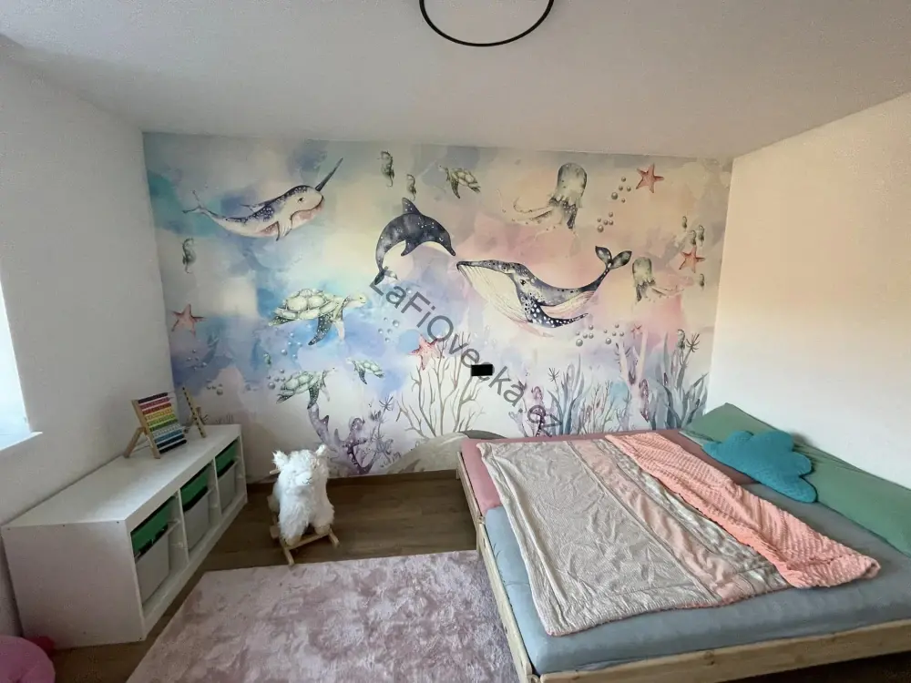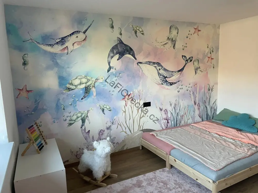 Tapeta na zeď - Podmořský svět (velryba a delfín). Tuto tapetu je možné přizpůsobit dle přání zákazníka včetně přidání motivů podmořského světa a přizpůsobení velikosti a místění.