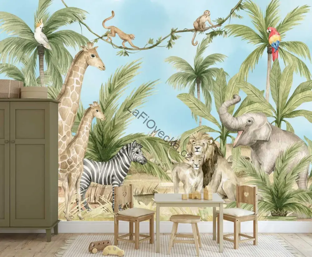 Tapeta na zeď - Safari džungle (žirafa, zebra, slon a lvi) | akvarel. Tuto tapetu je možné přizpůsobit dle přání zákazníka včetně přidání motivů safari zvířat, případně upravit výšku od podlahy pokud jsou před zdí kusy nábytku.