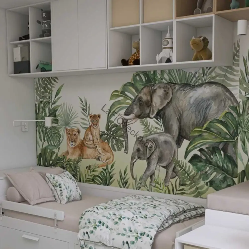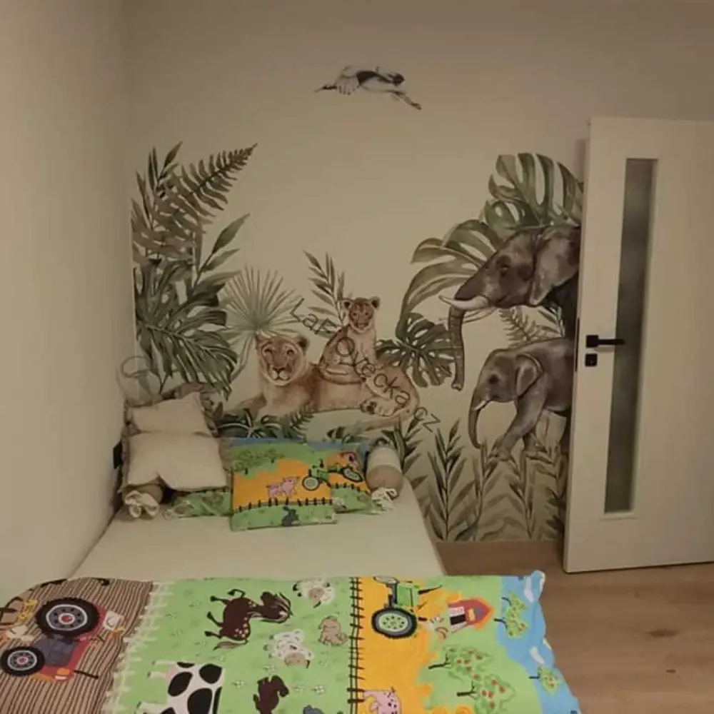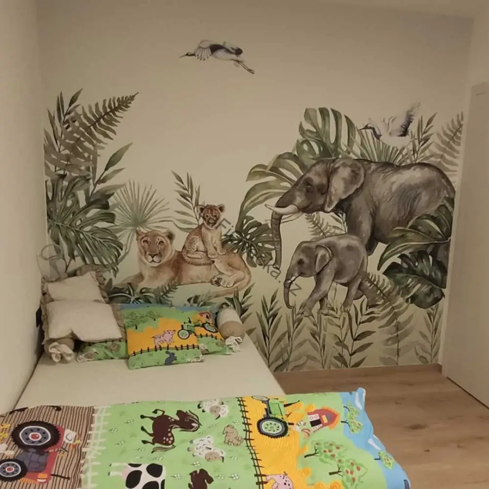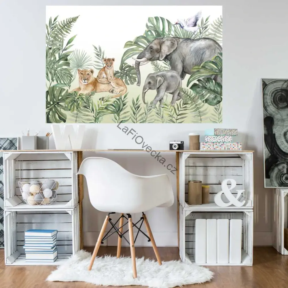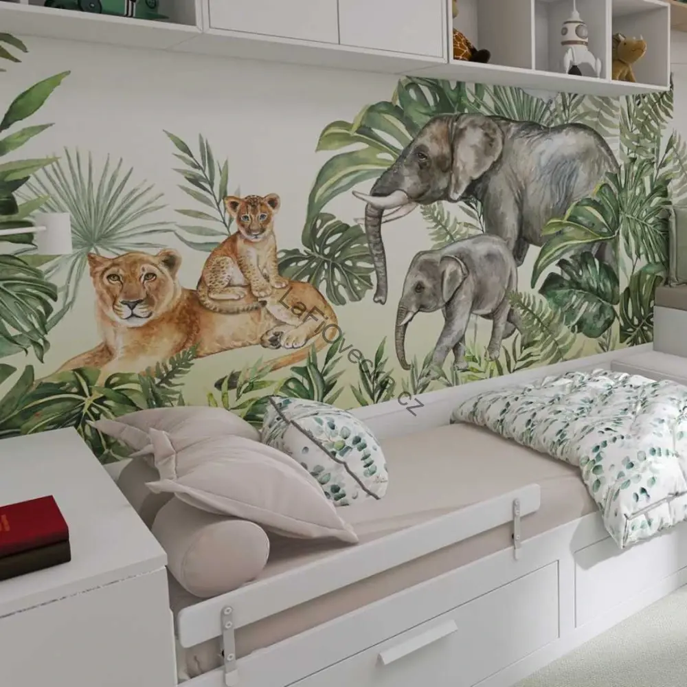 Tapeta na zeď - Safari kamarádi (sloní rodinka a lvice s mládětem) | akvarel. Velm oblíbená tapeta, vhodná jako tapeta za postel.