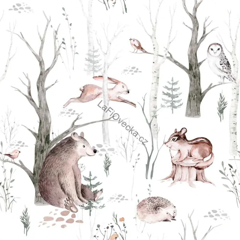Tapeta na zeď - Zimní lesní kamarádi (medvídek, zajíček, ježek a sovička) | akvarel. Jedná se o navazující motiv, opakující se.