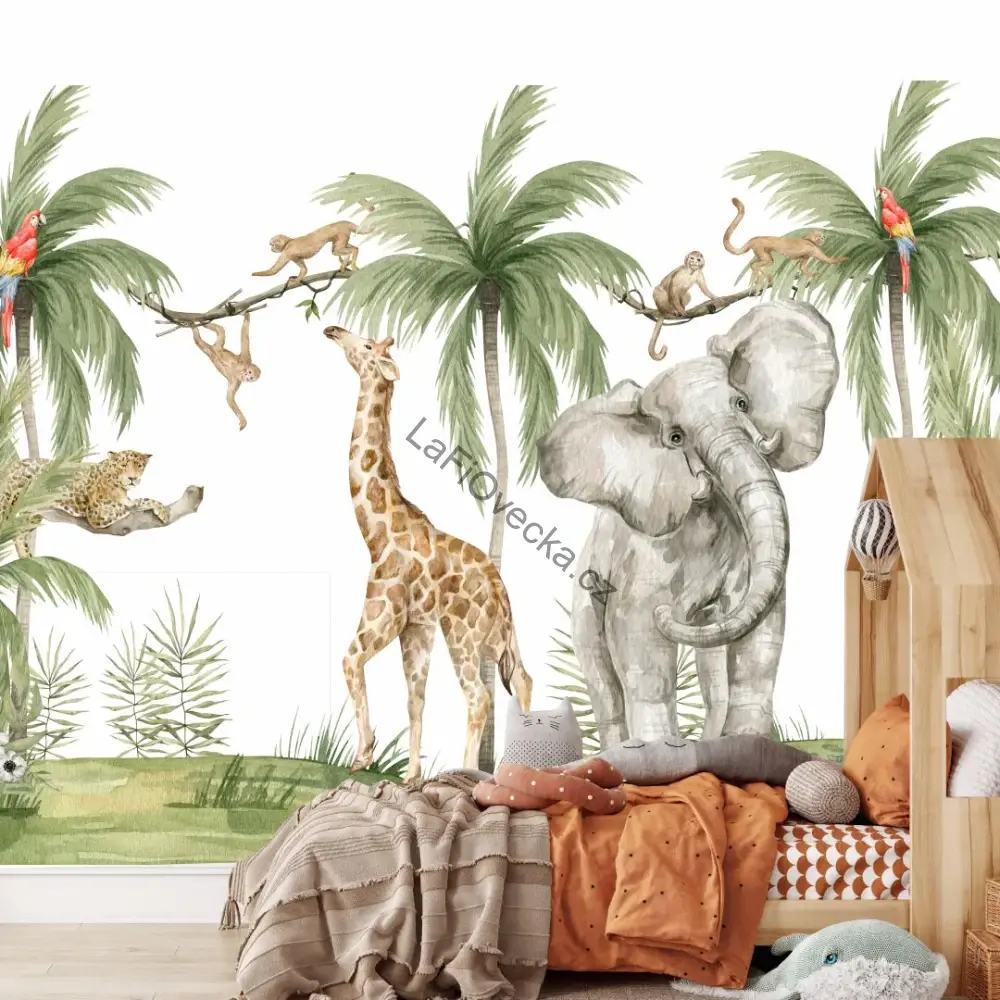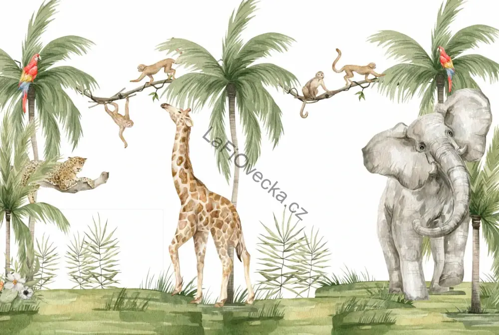 Tapeta na zeď -  Safari na bílé (žirafa, slon a opičky) | akvarel. Pokud se vám líbí tyto safari motivy, stačí vybrat materiál a vložit jako poptávku do košíku. Tento motiv tapety je vzor. Zvířata lze přizpůsobit pozice a velikosti přesně dle přání zákazníka.