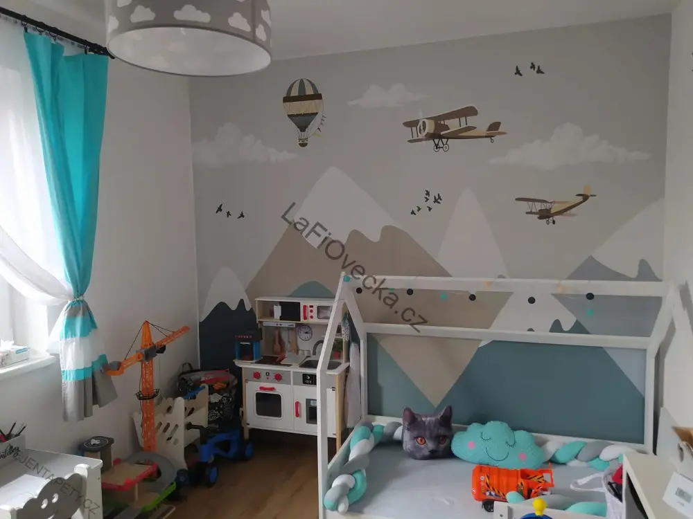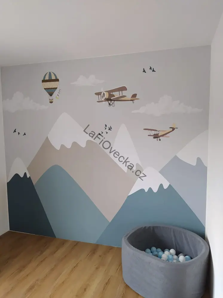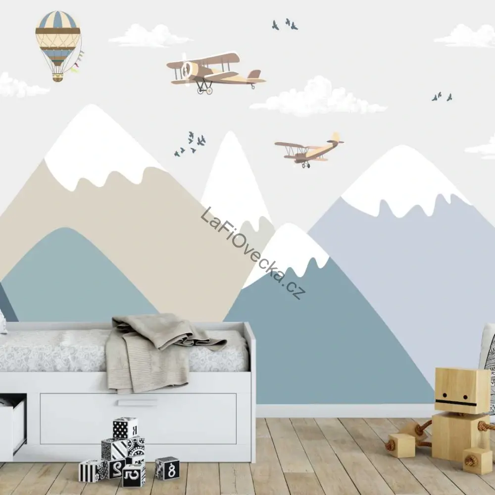 Tapeta na zeď - Hory, balóny a letadýlka. Doporučujeme jako decentní dekorace do chlapeckého pokoje.